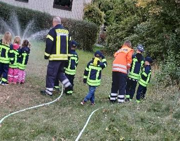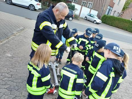 Am 30. September traf sich die Kinderfeuerwehr, um Neues über die Feuerwehr zu lernen. Das Thema war heute die Wasserzufuhr/Leitung durch das Setzen des Standrohrs, das Legen eines C-Druckschlauchs zum Verteiler und das Umsetzen mit drei D-Druckschläuchen und drei D-Mehrzweckstrahlrohren. Die Kinder zeigten sehr hohe Lernbereitschaft und Interesse an den Gerätschaften. Natürlich durften die Befehle „1. Rohr Wasser marsch” und „1. Rohr Wasser halt” nicht fehlen. Im Anschluss wurden stolz die Kinderflammen 1 und 2 verteilt. Herzlichen Glückwunsch an alle, die bestanden haben. Das habt ihr großartig gemacht!